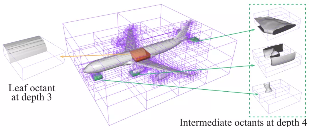 本工作得益于局部隐式场表示的灵活性和分层次递归表示的细节表达能力强的优势,如图1所示。通过将局部隐式场与每个八叉树节点单元相关联,解决了基于局部隐式场的几何建模和重建方法效率低下的问题。本工作提出的表示可以使用紧凑的存储对具有精细细节的大规模形状进行建模,并且可以用于表示具有任意拓扑的三维形状。