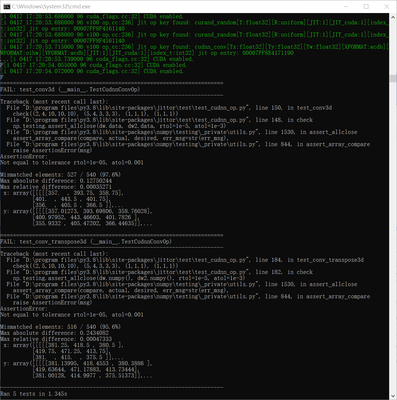 您好,这是因为cudnn不同平台、版本之间的计算精度会略有误差。从打印结果来看,计算是正确的。您可以忽略这个测试。