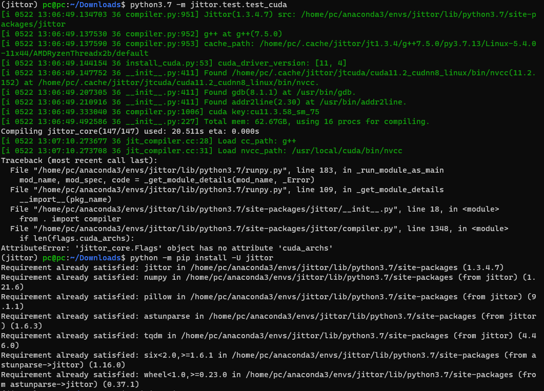 (jittor) pc@pc:~/Downloads$ python3.7 -m jittor.test.test_cuda
