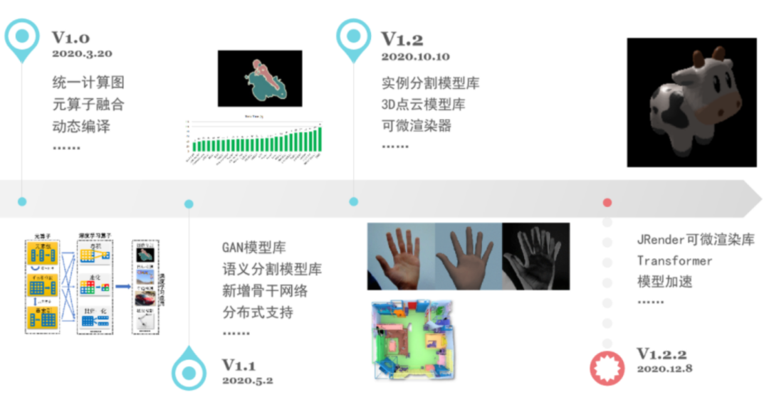计图又发布新版本了!12月8日Jittor发布1.2.2版本,推出了JRender 可微渲染库,并支持Vision Transformer。 从今年3月20日份发布以来,计图已经有若干个版本的迭代, 下图是Jittor更新历程。