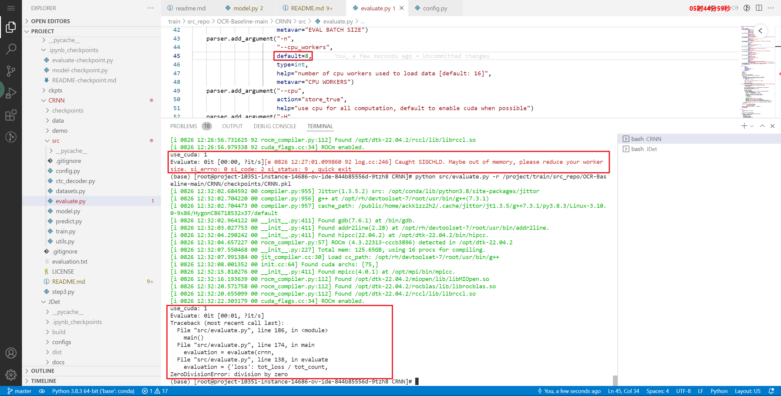 运行CRNN部分时出错,修改cpu_workers的default=8,再次运行时报错,这个该如何解决?