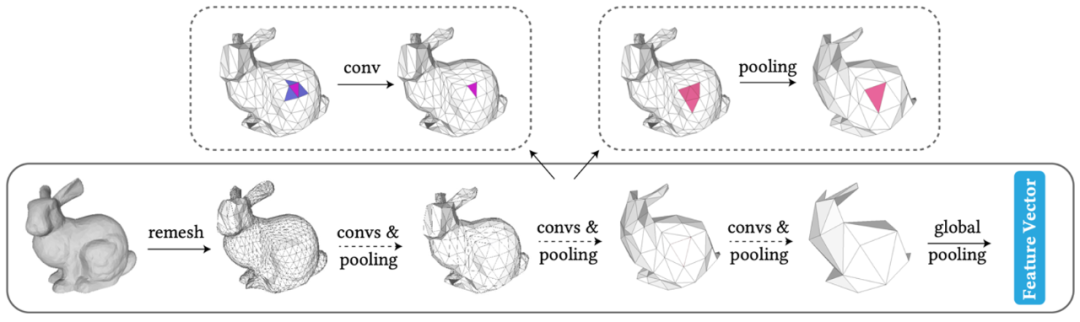 三维几何学习是计算机视觉与图形学中的一个重要研究方向,基于三维体素、点云、网格(mesh)等数据表示,学习物体的几何形状特征。其中,网格广泛应用于建模、渲染、3D打印等。因为网格数据较为复杂,包含点、边、面三种基本元素,缺乏规则的结构与层次化的表示,因此也更具挑战。