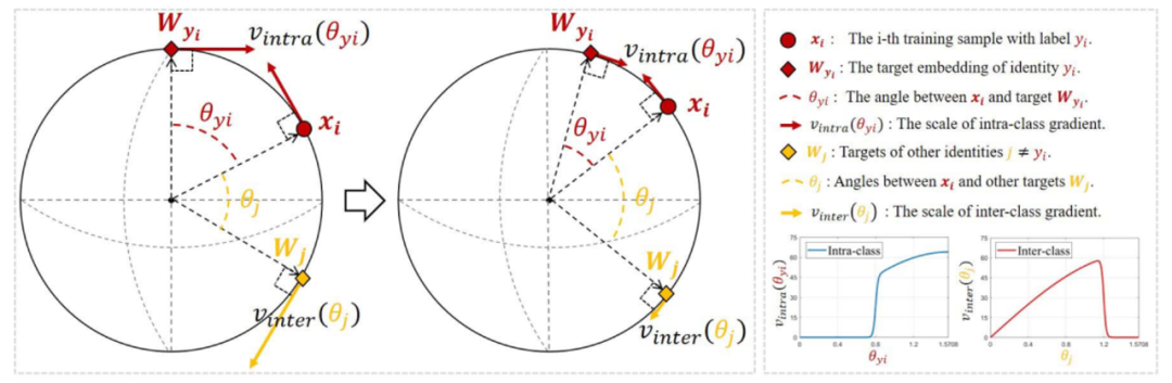 SFace相比于基于Softmax的大间隔鉴别损失函数[3],其优势即在于精确的类内和类间优化的梯度设计。传统基于Softmax的大间隔鉴别损失函数的类内和类间梯度相互耦合,难以控制。而SFace通过解耦类内和类间的损失,实现了梯度的精准编辑(见图3)。例如:当样本与它的类别向量夹角优化到小于某个角度后,快速地减小其产生的梯度,从而降低噪声数据的影响。