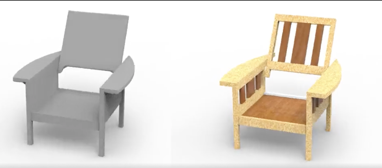 此外,为了解决三维模型上的孔洞等复杂拓扑难以刻画的问题,该方法利用纹理作为媒介,用纹理图片的透明通道来表示几何。如图5所示,原始的三维模型并没有孔洞,通过给三维模型贴透明纹理的方式,无需修改原三维模型的网格连接关系,就能表达椅背上的复杂几何拓扑。