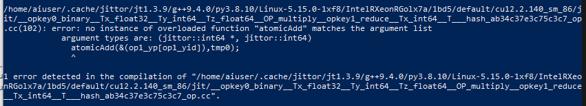 在 Ubuntu 系统上,使用 CUDA 12.2 时,编译器报错 “error: no instance of overloaded function “atomicAdd” matches the argument list”,参数类型为 (jittor::int64 *, jittor::int64), 请问这最可能有什么愿意,如何解决?